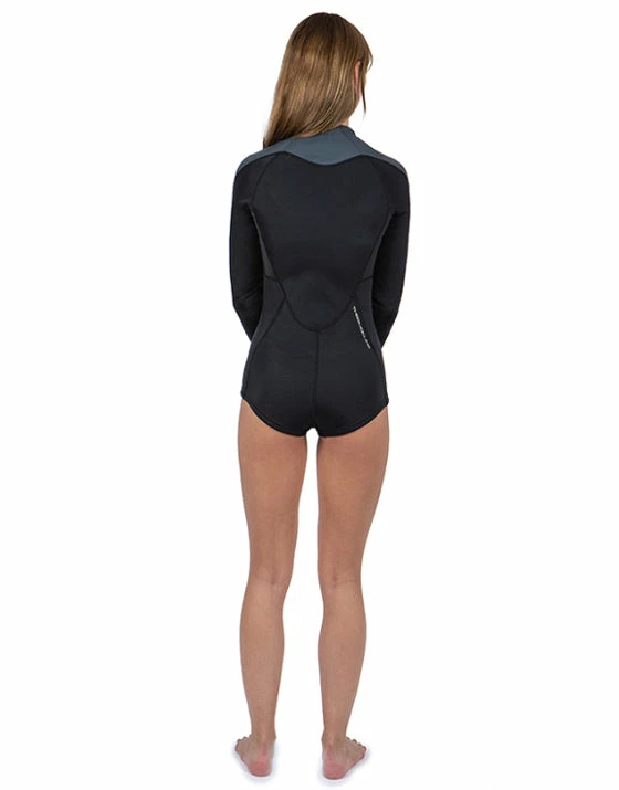 The women’s, Long Sleeve Swimsuit breaches the gap between traditional swimwear and a wetsuit, offering the equivalent of 2mm neoprene thermal protection this is the perfect option for wearing under a wetsuit or along for some warmth. A great option for warm water surfing and freediving. The front zip entry makes this super easy and convenient for getting in and out of.Â