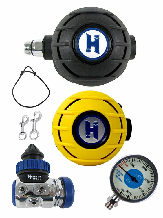 High quality and functionality meets professional and efficient design. This regulator set from Halcyon consists of the H50D fist stage (DIN), the Aura second stage, an Aura Octopus and a free Termo Gauge.