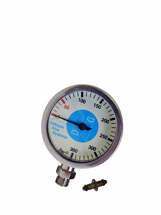 The Halcyon stage SPG has a nickel-plated brass body with an acryllic lens, to make the gauge light weight. The lighter weight and smaller profile makes these gauges ideal for use with stages and deco bottles.