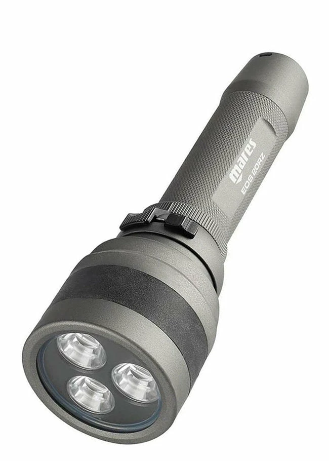 The Mares Eos 20RZ Dive Torch is a powerful primary torch with 2300 lumens LED light, perfect for night dives or low visibility, providing a wide light beam. It provides up to 100 minutes of light and is rechargeable via a USB charger.Â