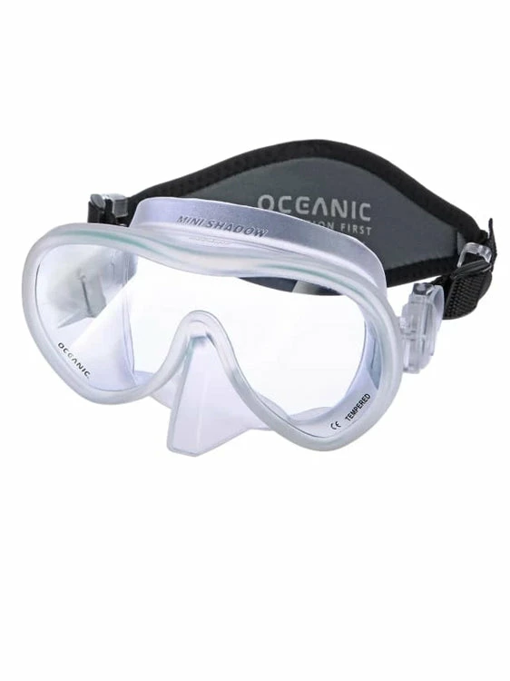 The Oceanic Mini Shadow Ice mask is a single lens, low volume dive mask with a clear skirt for an unmatched field-of-view! The narrow silicon skirt fits perfectly on smaller faces and is the mask of choice for many underwater models!