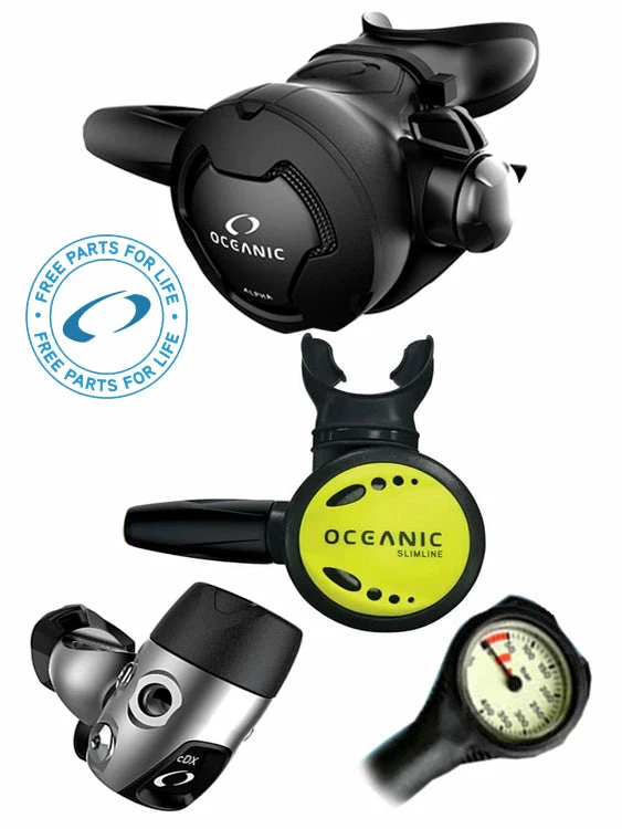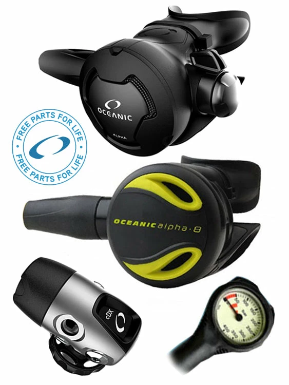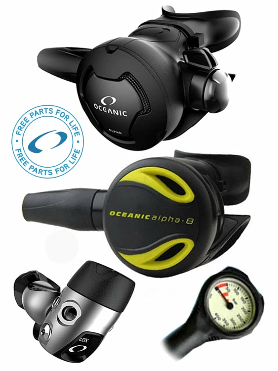 This regulator set includes an Oceanic Alpha 8 Octopus (or Slimline: +$40), and a free Termo pressure gauge.