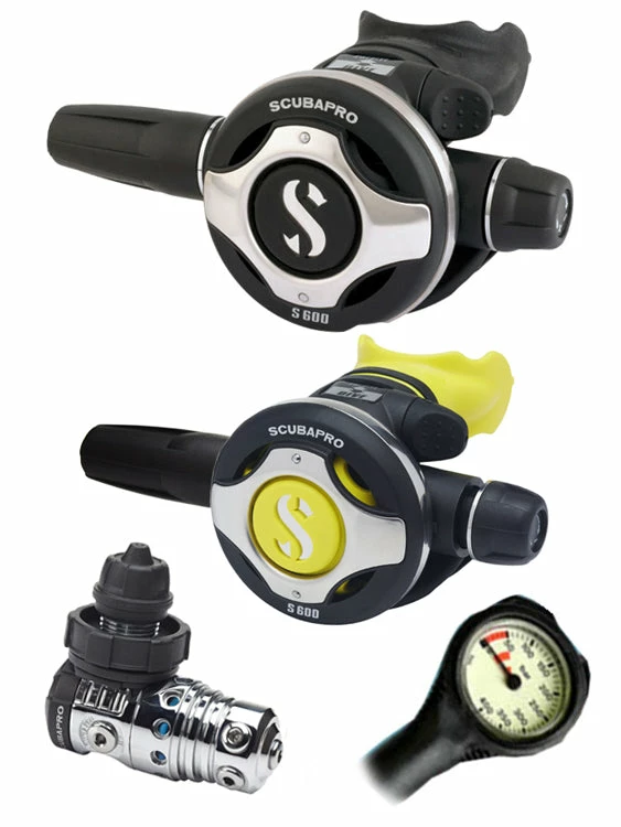 This regulator set features Scubapro’s MK25 EVO first stage, the S600 second stage, the Octopus R095 (or R195) plus a termo gauge. This reg set is an excellent choice for a variety of dive conditions and it has ranked as one of the top-performing regulator systems on the market for years.