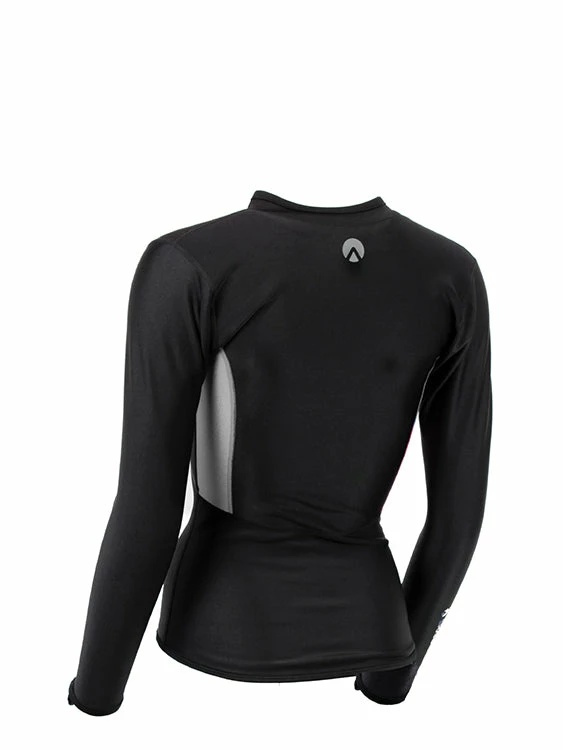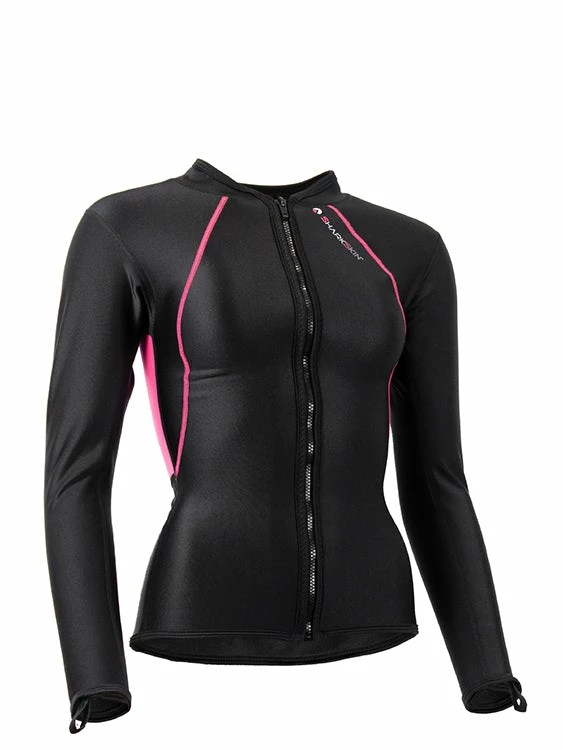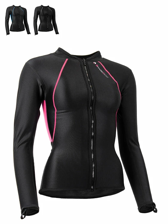 This is Sharkskin’s Chillproof Long Sleeve Full Zip with an ergonomic cut for women. It is designed to add an extra layer of warmth while you engage in your favourite watersports, such as paddling, surfing, sailing, snorkelling or diving. It works super well as a standalone, or as an extra layer underneath your diving suit. The full zip helps you with easy donning and doffing.