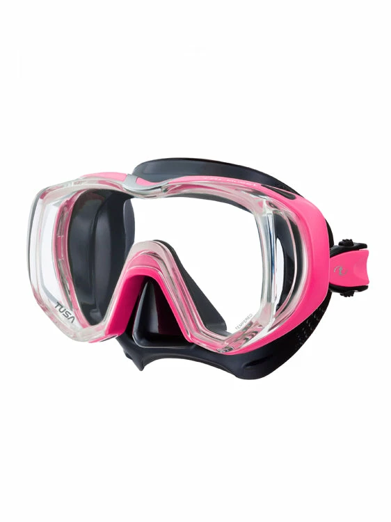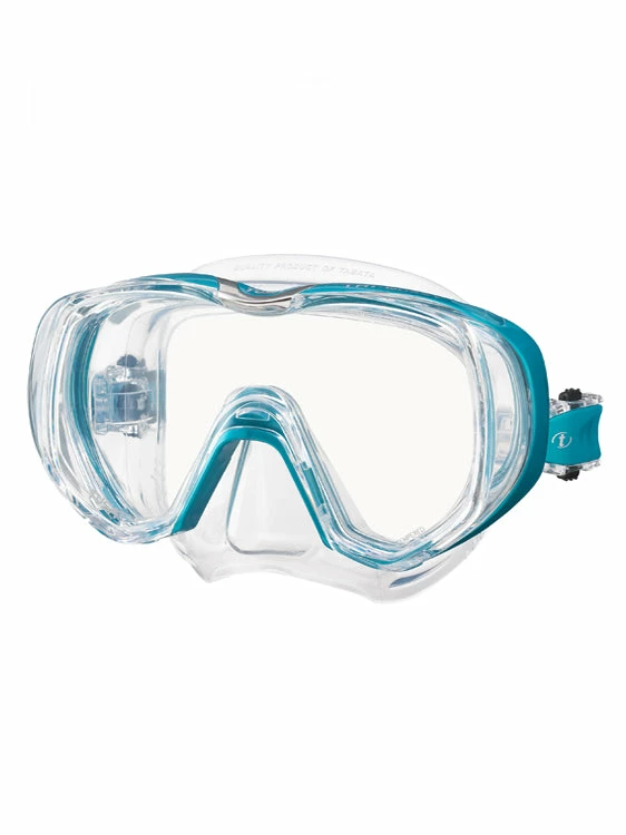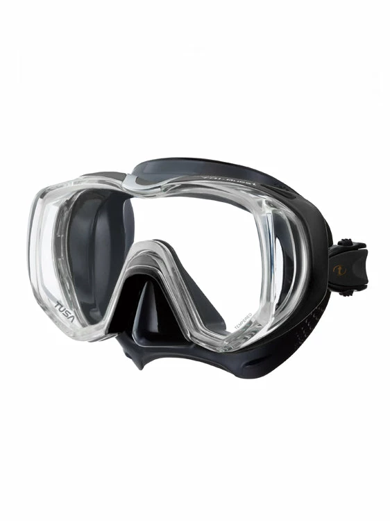 The TUSA Freedom Tri-Quest mask is a single lens mask with two domed side windows providing an expanded field of vision and a super soft seal!