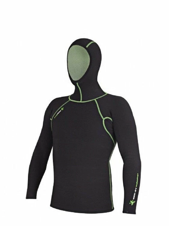 The Frogskin hooded long sleeved vest is a 0.5mm ultra stretch neoprene undergarment with a very quick drying fleece inner lining, specifically designed for water sports such as diving, snorkeling and kayaking. The thumb-loops on the cuffs make it easy to slide the undergarment through the sleeves of a wetsuit, but the vest can be used a stand alone as well for warmer waters.